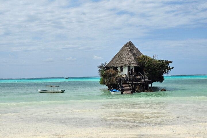 The Rock Restaurant, located on a small islet of Zanzibar’s Pingwe coast, It offers stunning views and is accessible by foot at low tide or by boat at high tide.